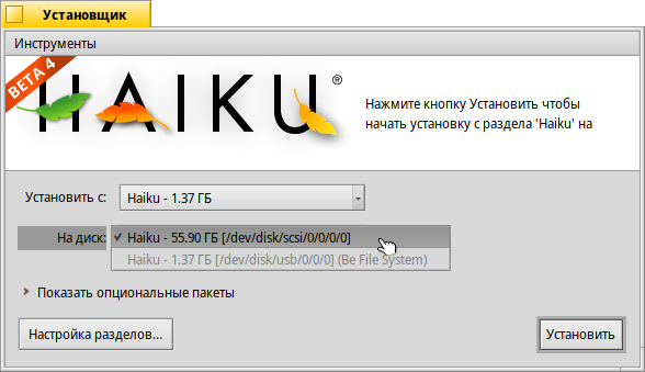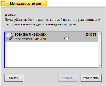 Выберите в открывшемся окне жёсткий диск, куда следует установить загрузчик (т.е. тот диск, на который ставили Haiku) и нажмите «Установить».