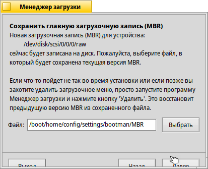 Сохраните на всякий случай текущую загрузочную запись MBR — просто нажмите «Далее»: