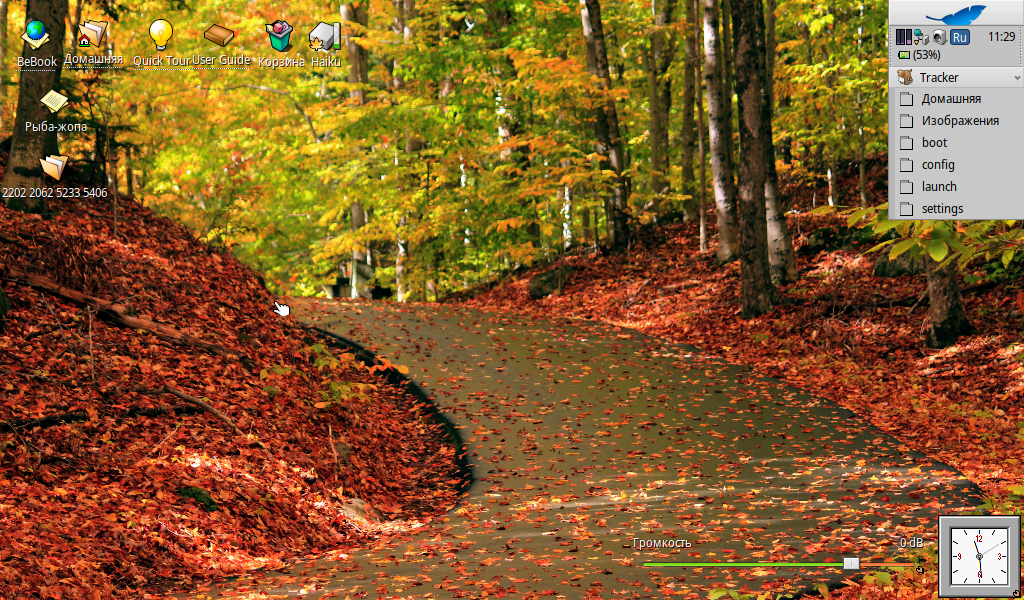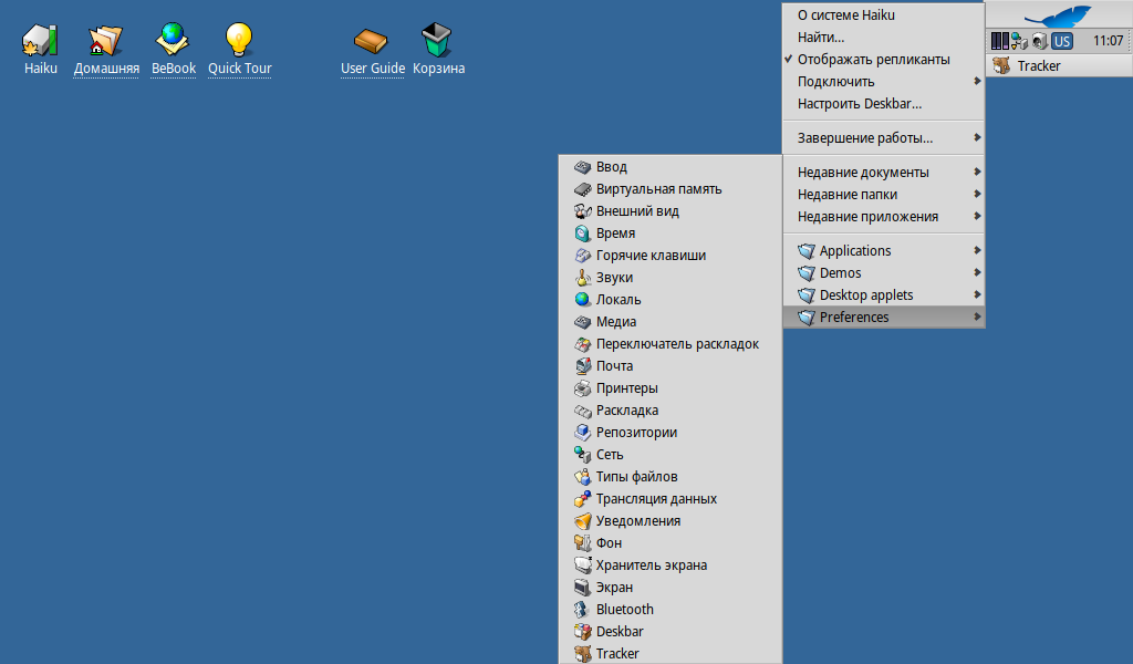 Что ж, система загрузилась. И первое, что она сделала, это отобразило окно с выбором языка. Выбираю родной великий и могучий, после чего нажимаю «Try Haiku». И сразу же показывается рабочий стол с иконками и Deskbar — некоим аналогом панели задач в Windows. Внешний вид у него немного другой, но логика работы с ним та же самая: тут тебе и главное меню (кстати, оно вызывается не клавишей Super с изображением логотипа Windows, а клавишей для вызова контекстного меню — не на каждой клавиатуре её уже встретишь), и панель уведомлений, и список открытых окон.