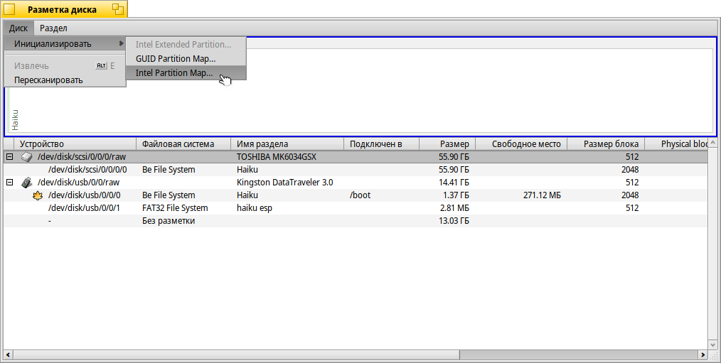 Для начала нам нужно разметить диск, на который установим Haiku. Для этого заходим в «Меню» -> «Applications» -> «Разметка диска». Интерфейс этой программы будет знаком тем, кто хоть раз в жизни работал с GParted или GNOME Disks, поэтому пояснять его я не буду.