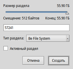 Нам нужно создать на жёстком диске раздел Be File System, на котором будет установлена наша Haiku. Для этого создайте раздел (Alt+C), укажите его тип «Be File System» и нажмите кнопку «Создать»: