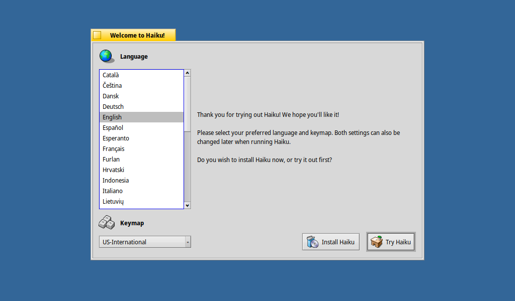 В отличие от первой обозреваемой мной ОС, Haiku делают загрузочные iso-образы для архитектур x86 и x86_64. Текущую на момент написания статьи версию Haiku R1 Beta 4 можно скачать отсюда. Далее образ пригоден к записи с помощью dd, Impression, Etcher, Rufus, etc…